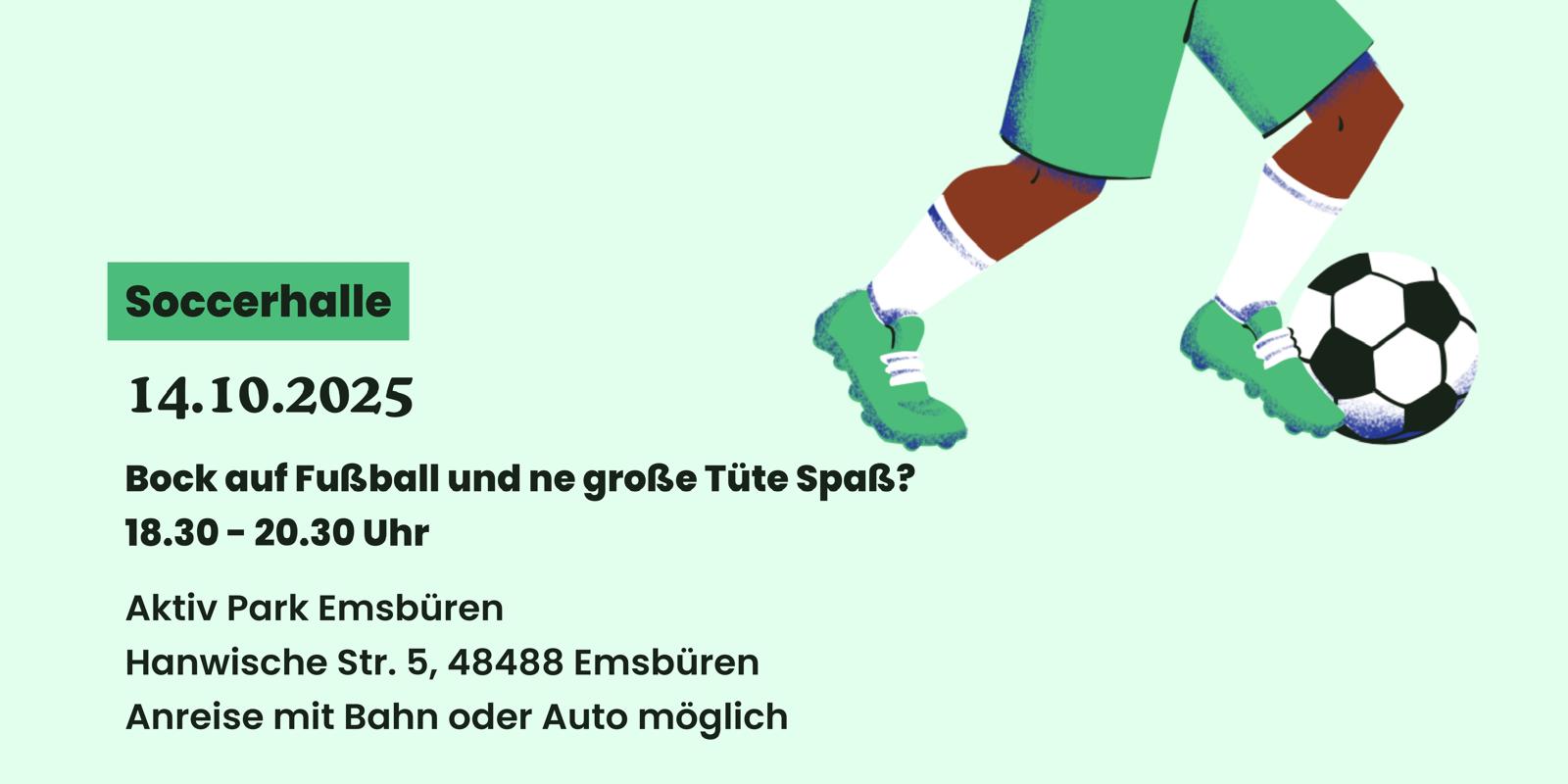 Schnür deine Fußballschuhe und sei dabei, wenn wir am 14. Oktober gemeinsam in der Soccerhalle Emsbüren kicken. Egal, ob du ein erfahrener Spieler bist oder einfach nur Lust auf Bewegung hast – wir freuen uns auf dich!